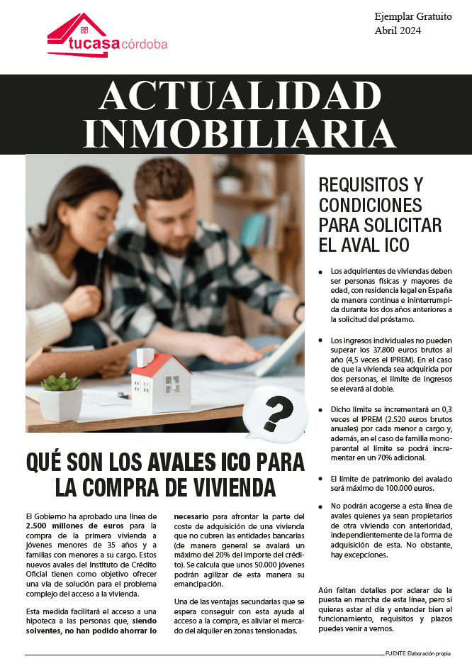 En esta nueva revista inmobiliaria del mes de abril, hablamos sobre qué son los avales ICO para comprar una vivienda, El Gobierno ha aprobado una línea de 2.500 millones de euros para la compra de la primera vivienda a jóvenes menores de 35 años y a familias con menores a su cargo.