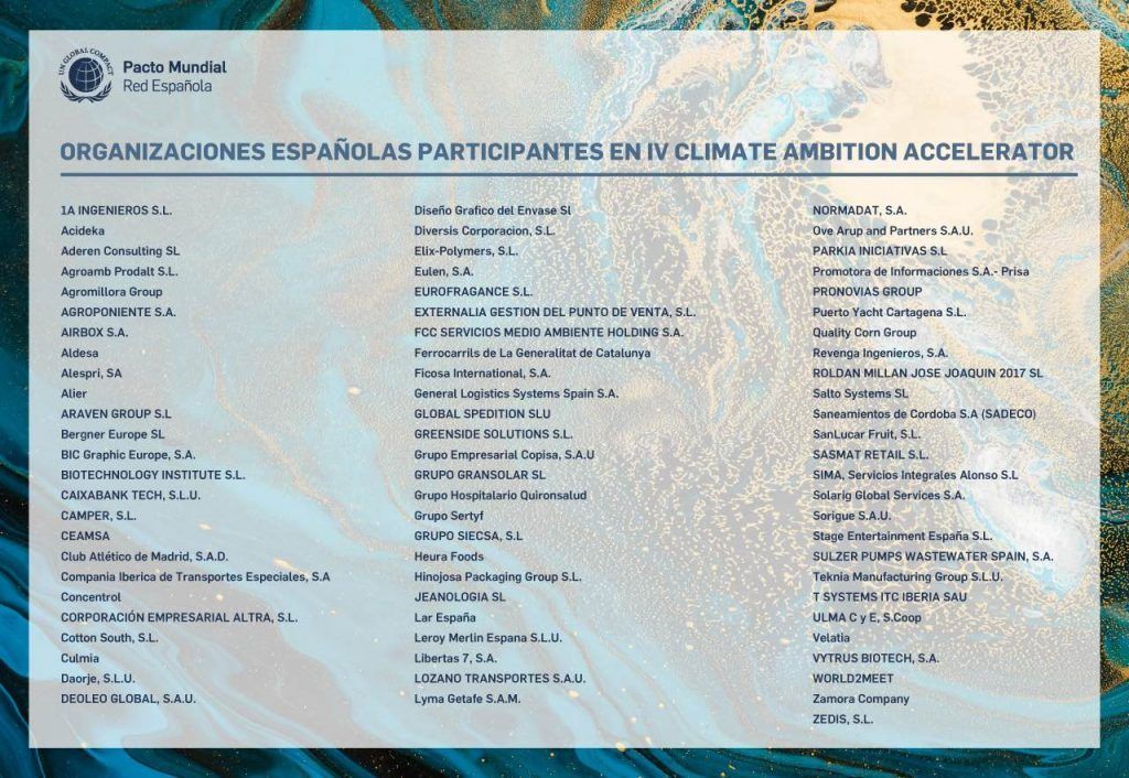 Con el objetivo de impulsar este compromiso y aumentar la participación de las empresas en la acción climática, el Pacto Mundial de la ONU España inaugura la cuarta edición del programa Climate Ambition Accelerator, que ya cuenta con la participación de 75 empresas españolas que se unen al total de 2.608 participantes de las tres ediciones a nivel global. Éstas son: