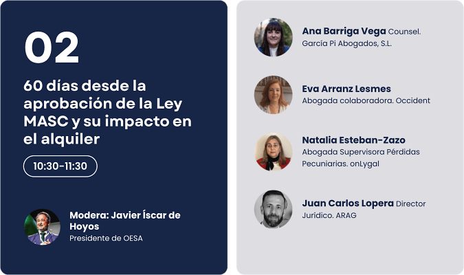 Bajo el título “El mercado inmobiliario en España: visión 360º”, la jornada ofreció una panorámica completa de la situación del sector, abordando cinco mesas temáticas que trataron desde la aplicación de la nueva Ley MASC, hasta el crecimiento del seguro de impago en viviendas y locales comerciales, pasando por el análisis de la inversión inmobiliaria en el contexto económico actual.