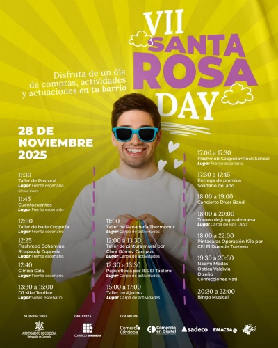 El pasado 28 de noviembre de 2025, las calles del barrio de Santa Rosa y Valdeolleros se llenaron de color, música y vida con la celebración de la VII edición del Santa Rosa Day, una jornada festiva organizada por la Asociación de Comerciantes del Centro Comercial Abierto Santa Rosa/Valdeolleros, con la colaboración del Ayuntamiento de Córdoba, Comercio Córdoba y otras entidades.