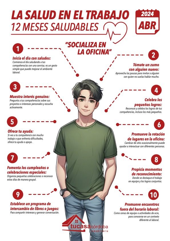 La calidad de vida en el trabajo va más allá de un escritorio ergonómico o una silla cómoda; implica también la calidad de nuestras interacciones diarias. Tucasacórdoba, consciente de la importancia de un ambiente laboral sano, presenta su programa de abril, dedicado a la «Interacción Social«. Tras abordar consejos generales, ergonómicos y de alimentación en meses anteriores, ahora el foco se sitúa en la socialización. Aquí te presentamos los consejos con ejemplos prácticos que los ilustran: