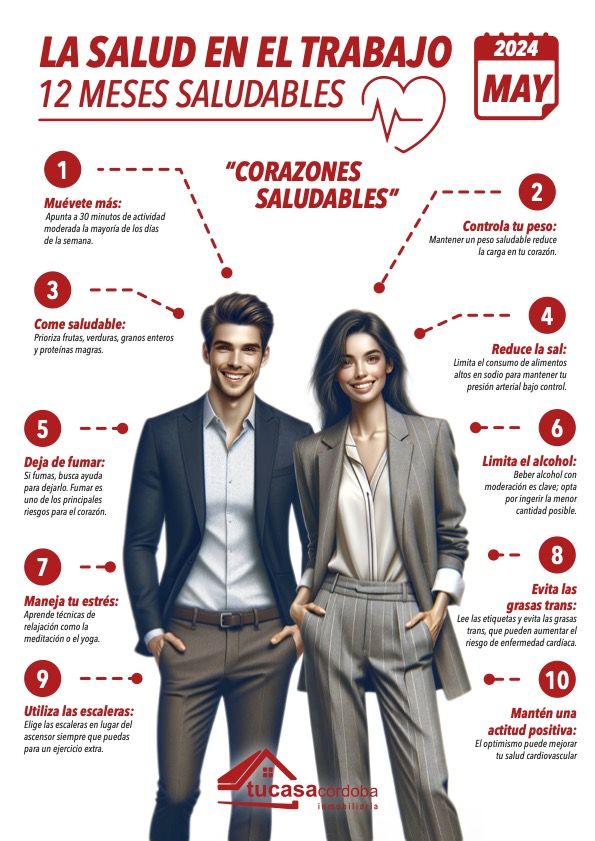 En Tucasacórdoba, estamos comprometidos con la salud y el bienestar de nuestros empleados y colaboradores. En mayo, nuestro enfoque se centra en la salud cardiovascular, vital para una vida larga y productiva. Este mes, bajo el lema «Corazones Saludables«, buscamos fomentar hábitos que prevengan enfermedades cardíacas, ataques al corazón, accidentes cerebrovasculares y problemas relacionados con la hipertensión arterial.
